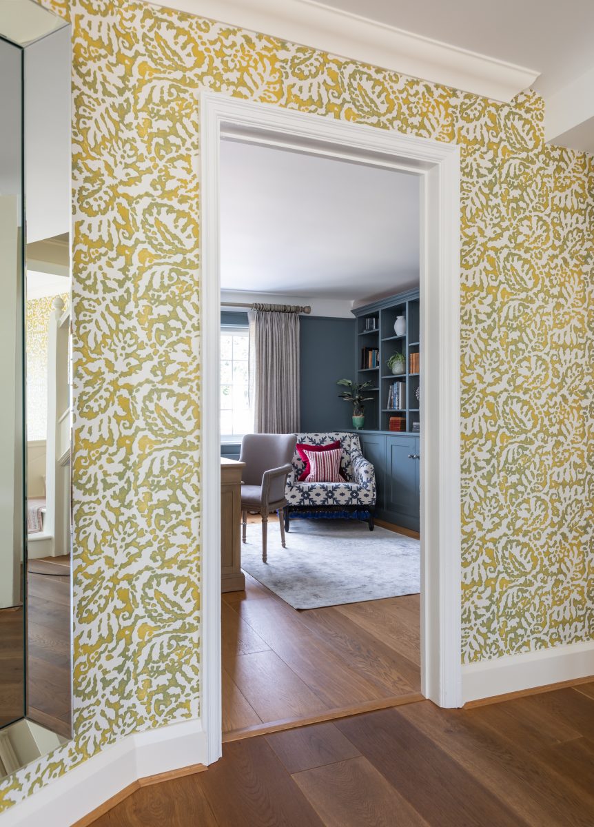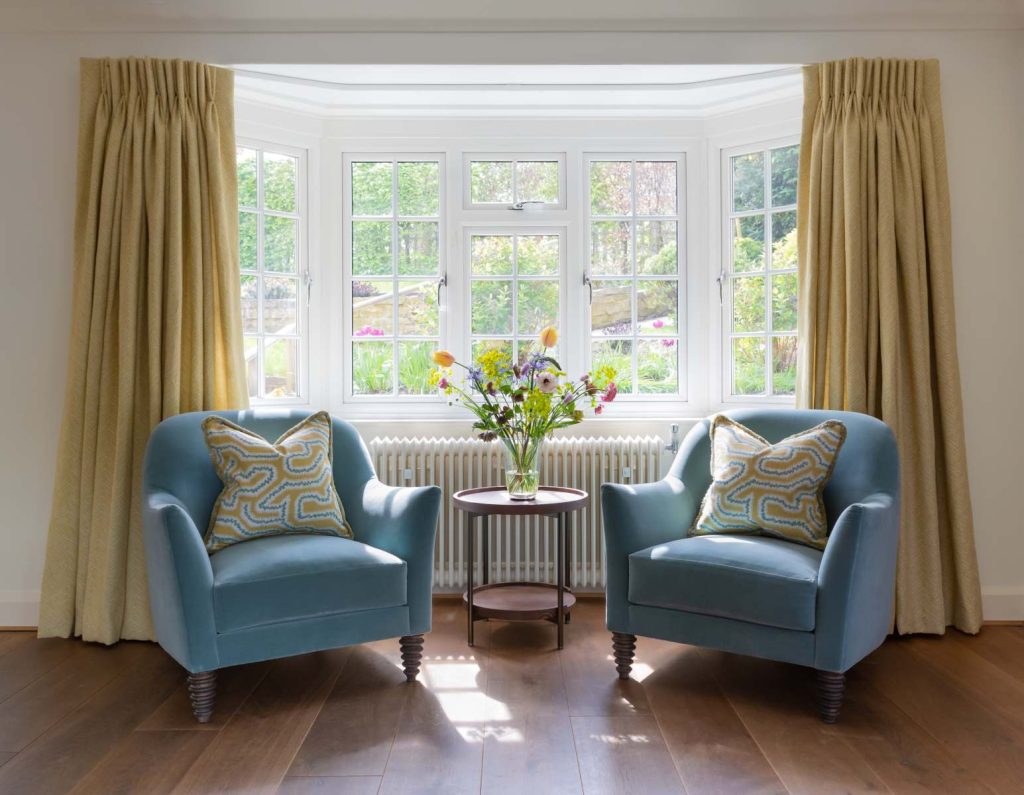 The search began for wallpaper options, new seating and floor length curtain fabrics for the bay window. This hallway was blessed with the sunshine in the morning, so the bay window was the perfect place for your morning coffee. We selected two armchairs from Love Your Home, upholstered in a soft blue which have an elegant shape with turned wood legs. The fabric for the curtains was a yellow herringbone pattern which perfectly complemented the hand printed wallpaper from Rapture and Wright, which has a stylised leaf design. We chose this paper to go in the hallway and up the stairwell wall. The striped carpet from Roger Oates worked well with the wallpaper and Treron from Farrow and Ball on the spindles and further upstairs on the landing walls.