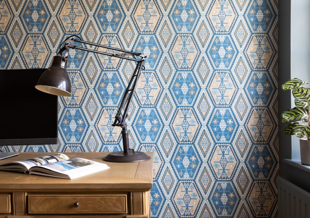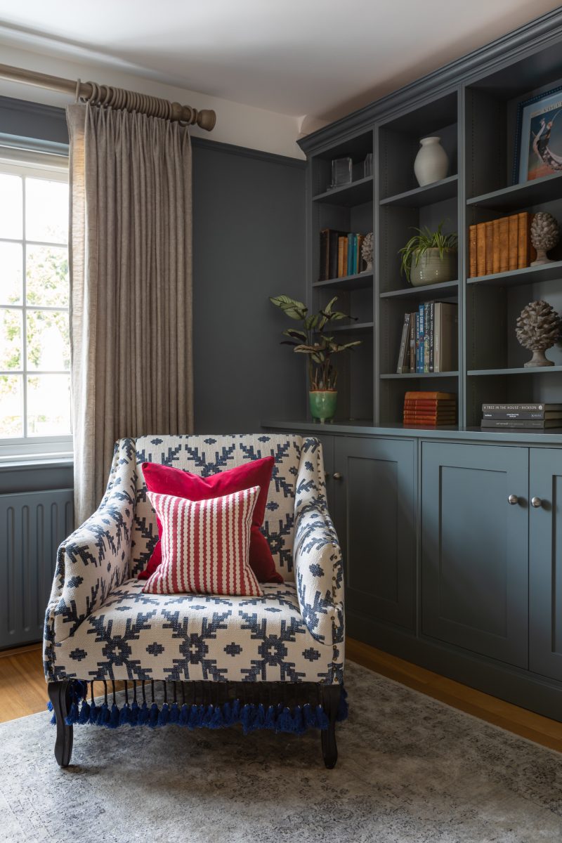 My client wanted to feel calm and focused in the space, so we worked together with blue being a favourite colour. The desk was selected from Oka for its warm natural feel, giving a sense of grandeur with its traditional style. The wallpaper added some interest to the wall behind the desk giving a country house feel with a modern colour palette. The wool, sheer, paisley fabric from Hodsoll McKenzie added an extra touch of luxury to the window. Unlined, it gives shade when required and hangs beautifully to one side of the window. I sourced the cushion from Tori Murphy on the armchair adding a touch of ‘handmade’ in a beautiful cherry red colour.