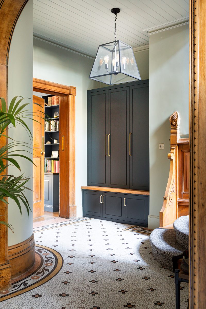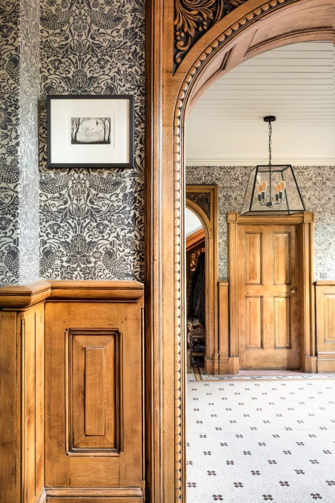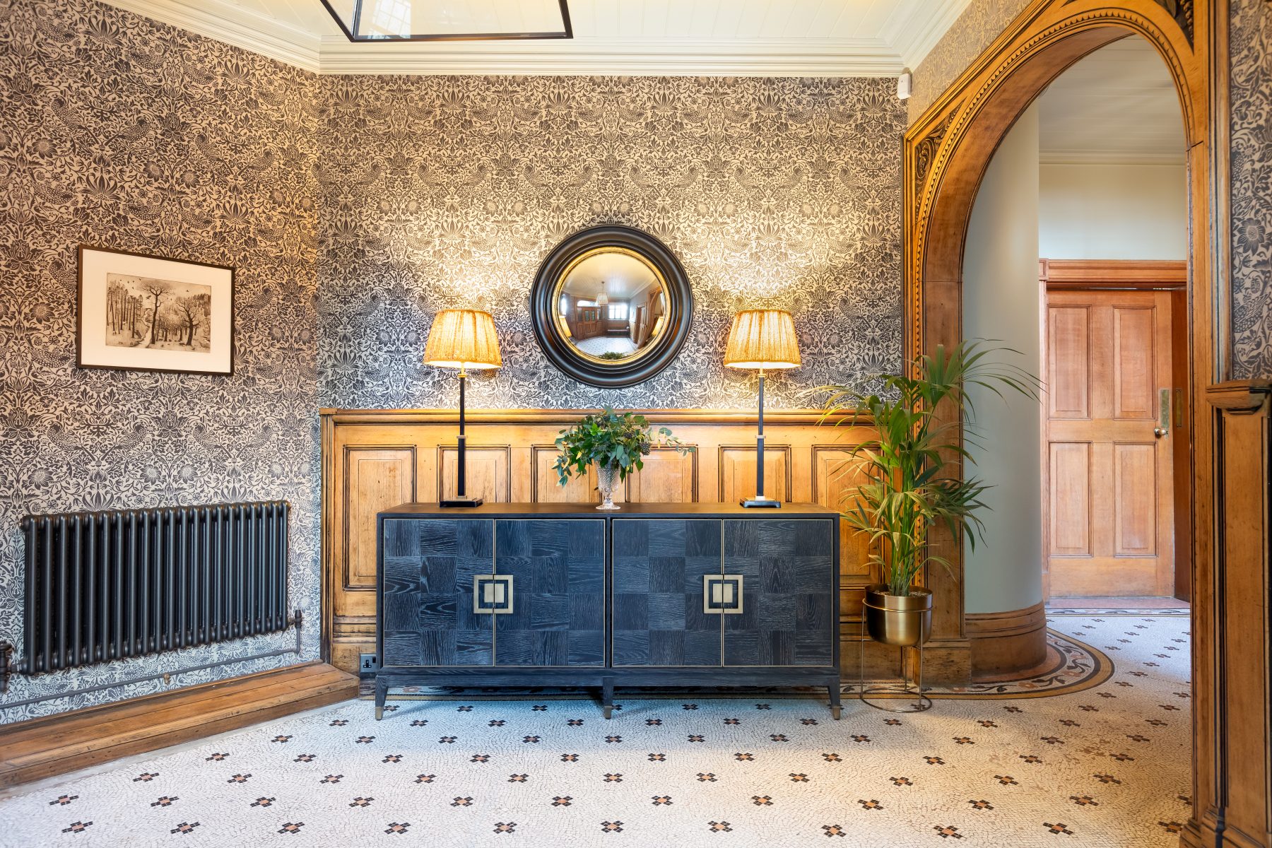 The wallpaper had to complement the panelling, fitting with the colours of the the wood carving, which had a black stain applied. The period of the house is Victorian and we wanted to work with the style of all the original features. William Morris wasn’t the first place I looked, however when I found it, we knew that it was the perfect match. The storage furniture seen by the stairs was painted in ‘Off Black’ from Farrow and Ball, inside the cupboard I went for a bright contrast with ‘Charlotte’s Locks’ also from F&B. The soft black wood of the credenza cabinet made a statement without taking over from the panelling and wallpaper. The fish eye mirror from Pooky gives a full reflection of the space. The large pendant lights needed to give maximum light to the space as the hallway is quite dark generally, so they were chosen with functionality primarily.