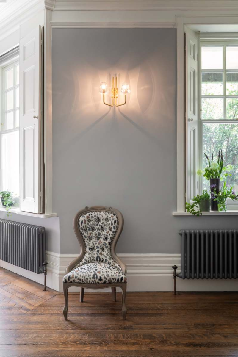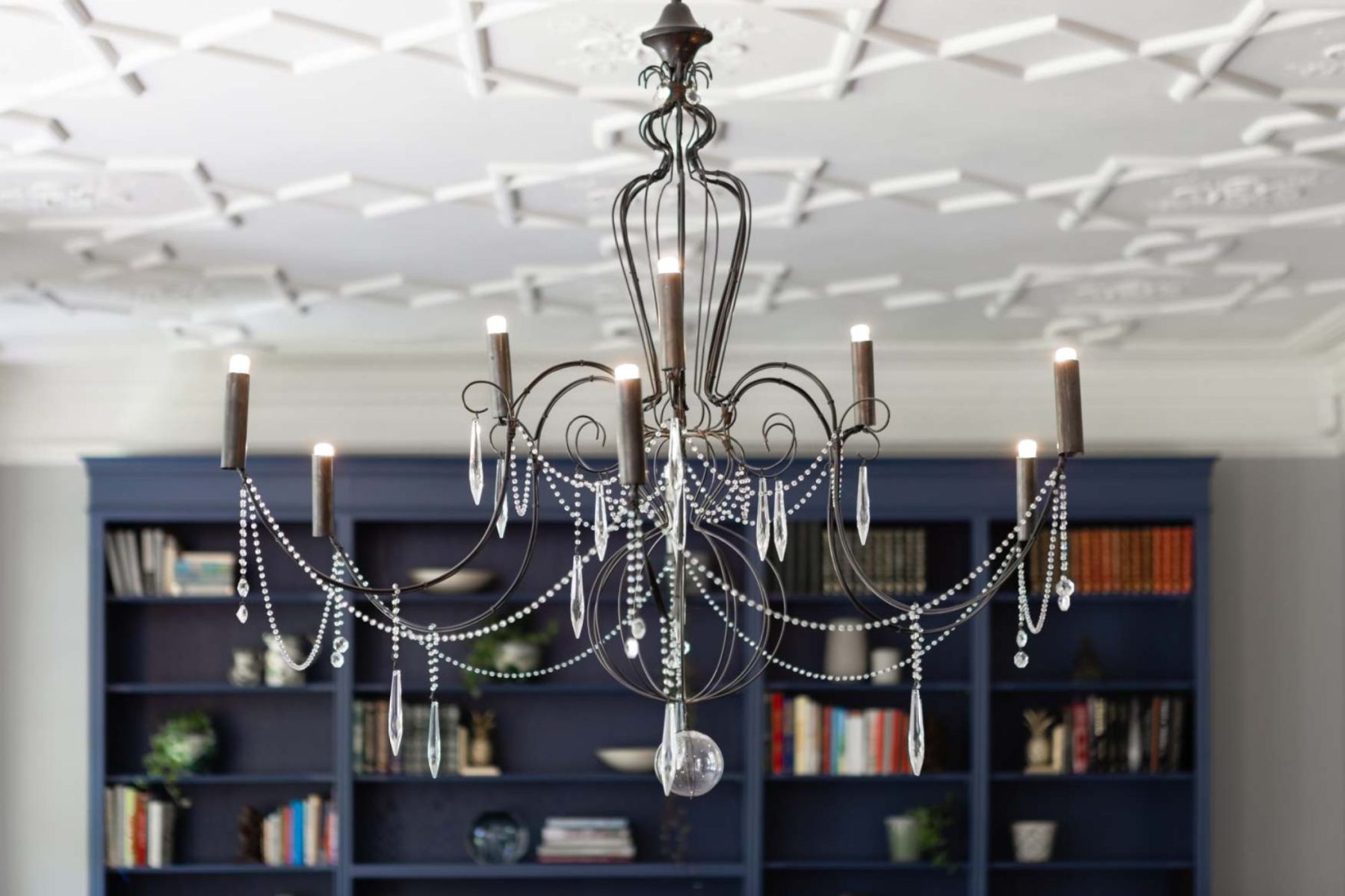 Having decided on a layout, whilst simultaneously scouting for suitable sofa shapes, a full plan was starting to come together. There were specific requirements for how each of them would sit on the sofa. One with legs out stretched and the other with legs tucked underneath. The chaise sofa was perfect for them. The bespoke bookcase, desk, was designed to have open display shelves and lower cupboard storage, with a space in the centre for the desk. This is a free standing piece which was made off site, and installed without any carpentry requirements. We decided the walls didn’t require wallpaper as there was so much beautiful cornice detailing, so we focused on the right paint colours to highlight the cornicing, architraves and skirtings. The armchairs by the fireplace and chandelier were sourced from a local independent design showroom. Whilst the coffee table, and side tables were from Andrew Martin. The cushions on the sofa are from A Rum Fellow and House of Hackney.