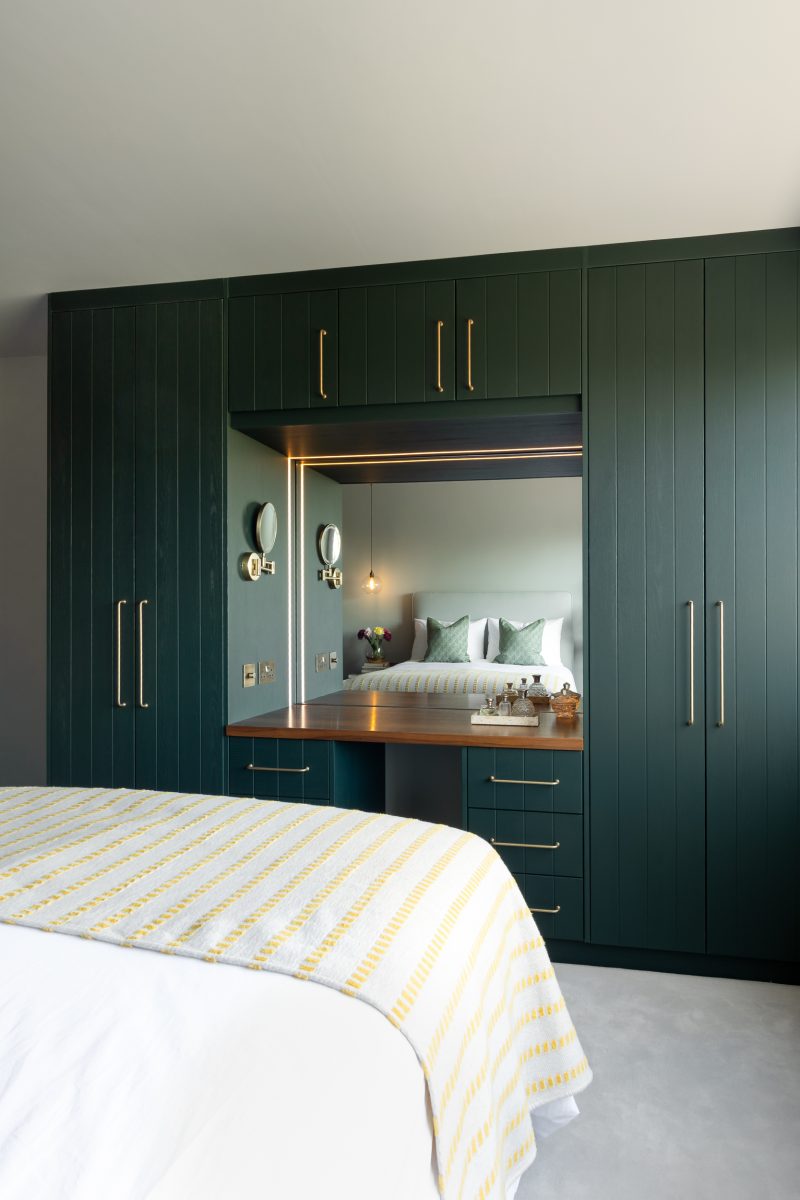 As this design was going to be all about storage there was a lot of preparatory work to get right before anyone was going to start on site. I designed the wardrobes to incorporate the dressing table, special attention was paid to the layout of the hanging spaces and drawers to ensure all the clothes would fit into their new home. Once on site we worked to a tight Christmas deadline so all trades were timed to allow for everyone to finish their work on time. The LED recessed channel lighting, framing the perimeter of the mirror on the dressing table were a key feature for me. The pendant lights were carefully positioned either side of the bed, each controlled by bronze switches adding that hotel vibe.